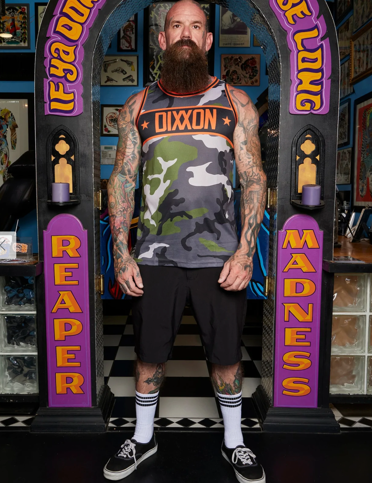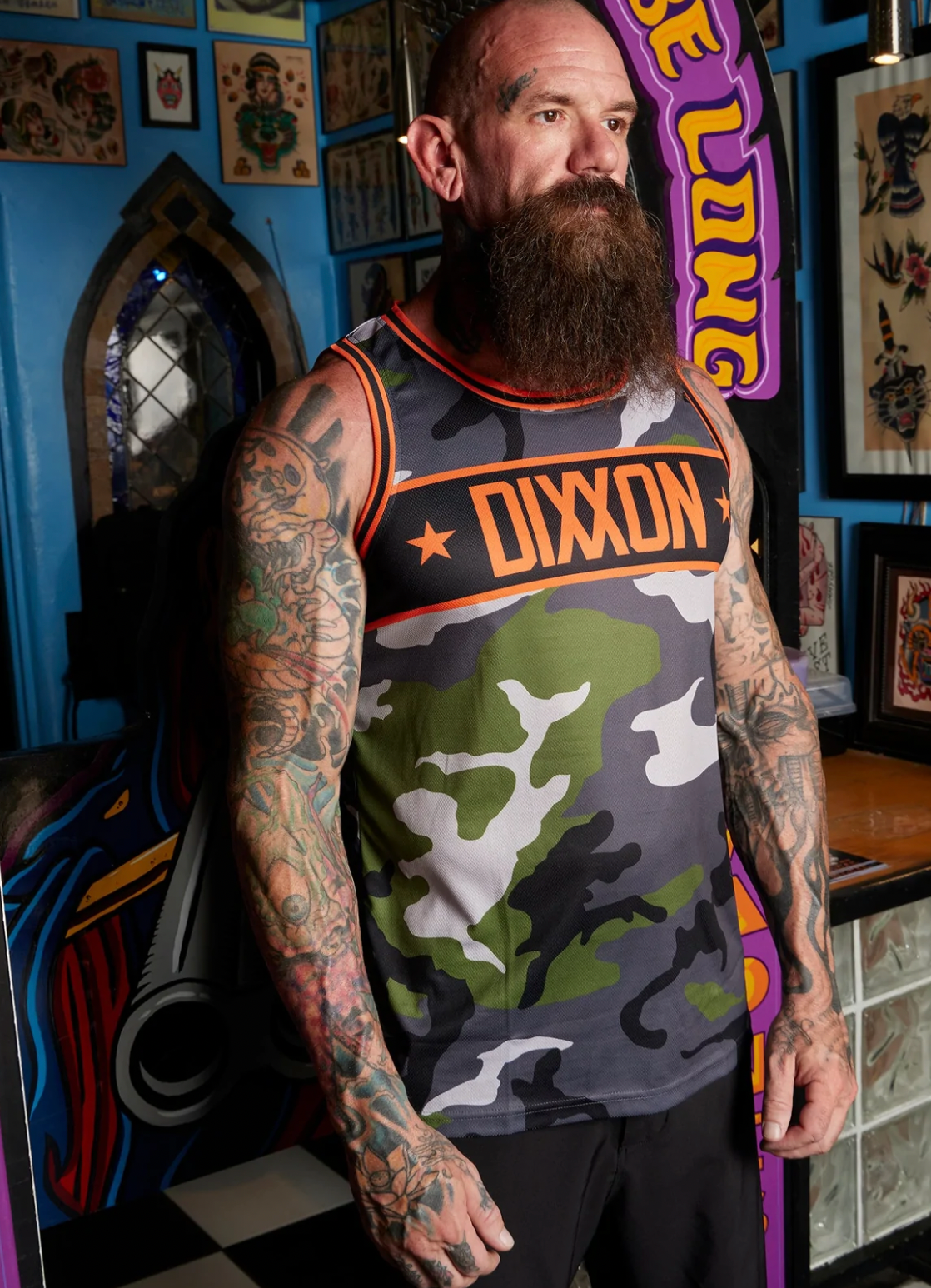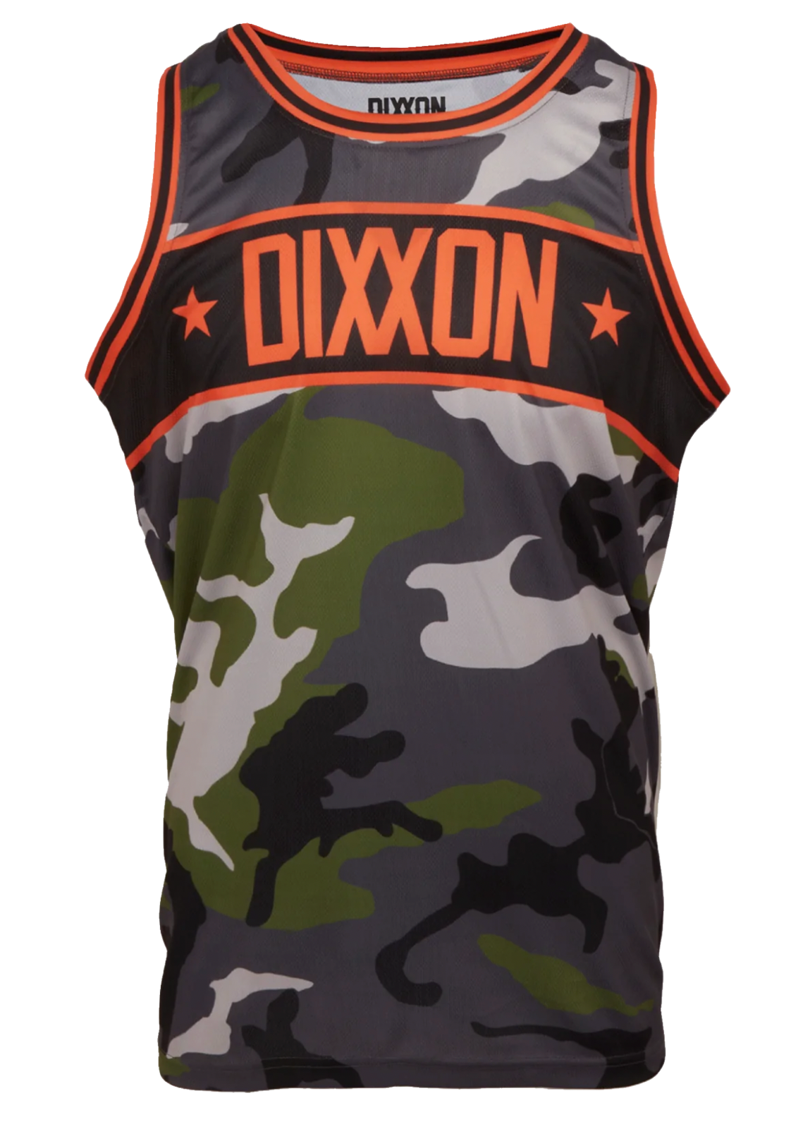 Look ready to step onto the court with the Men's Camo Basketball Jersey. This lightweight jersey-style shirt features a breathable mesh construction with a ribbed collar and sleeveless silhouette. Decorated with Dixxon logos throughout, the Pinstripe will add bold, sport-infused branding to any outfit you craft.