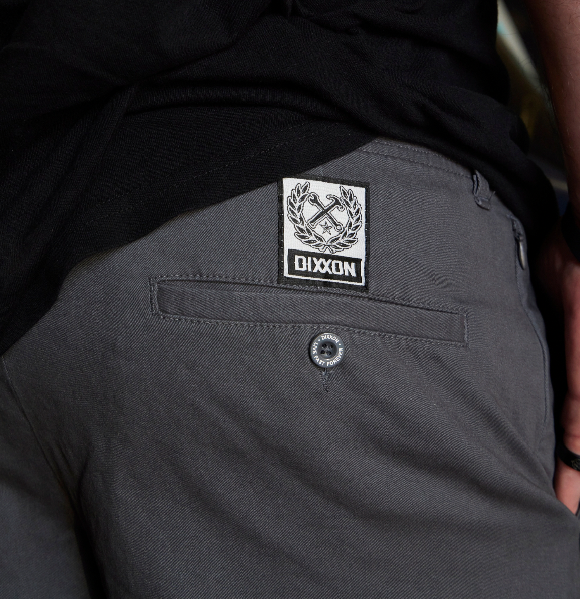 - Dual back welt pockets with Dixxon brand tag on the right pocket