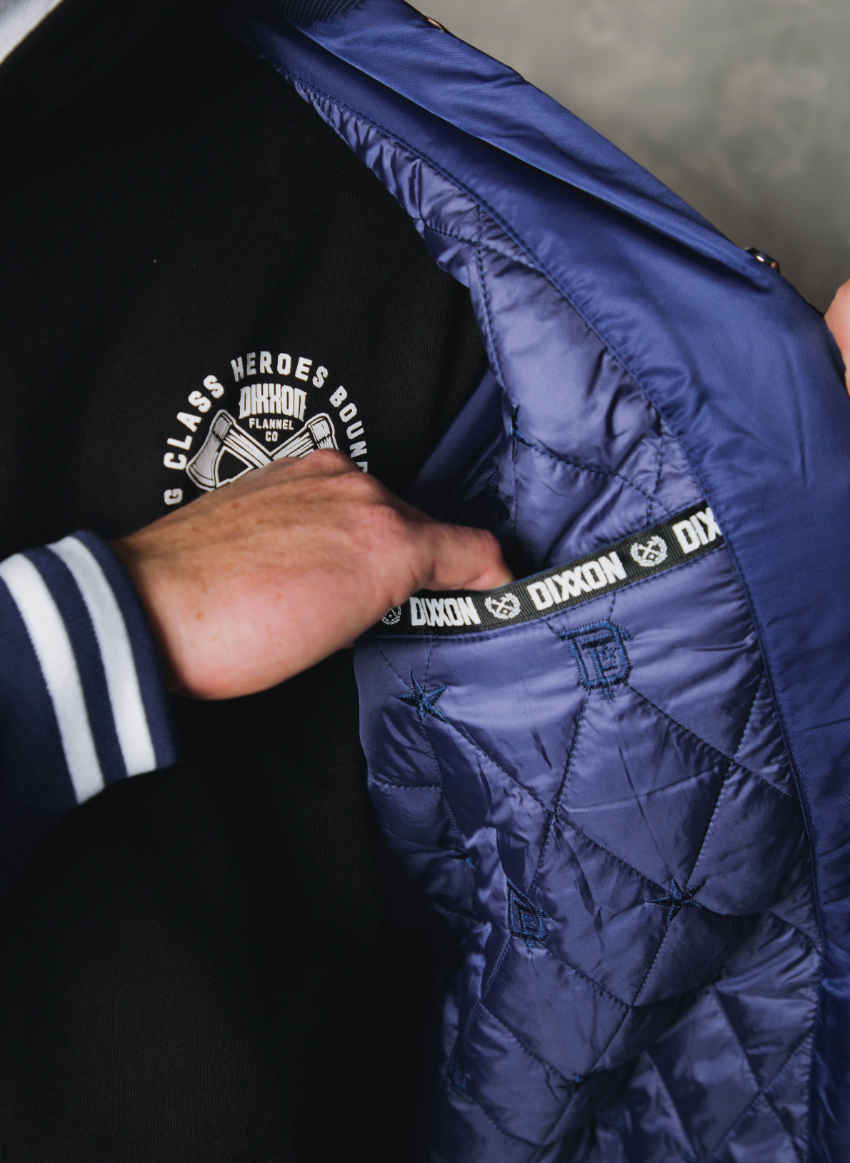 • Men’s blue and white varsity jacket