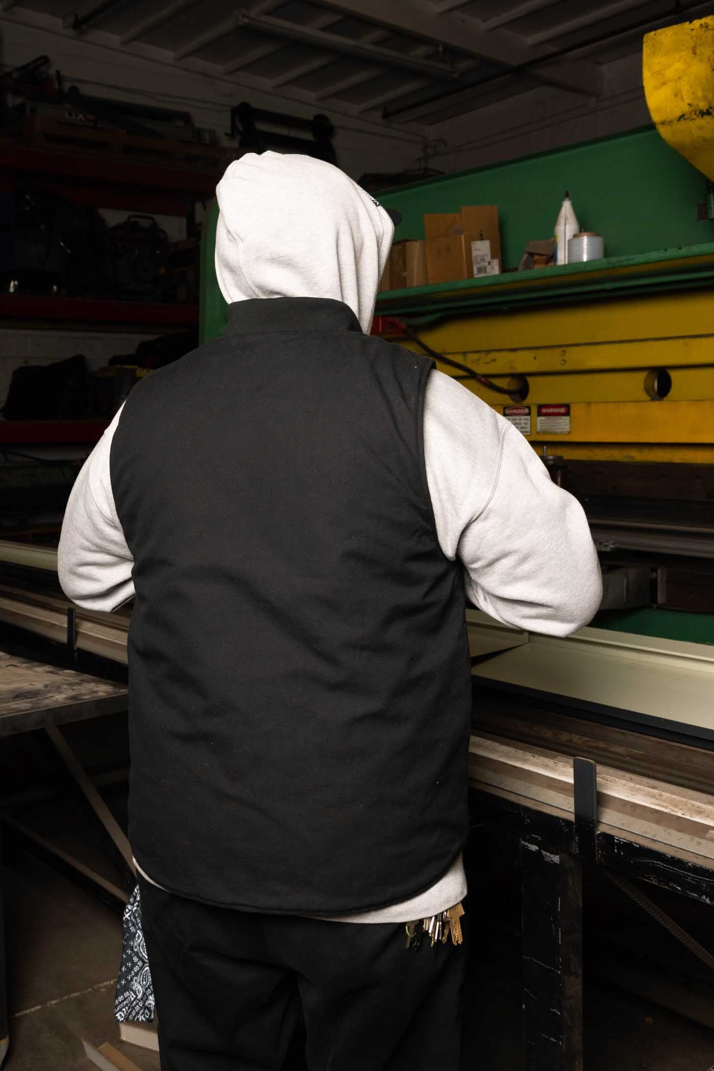 - Men’s black work vest with rib knit bomber collar