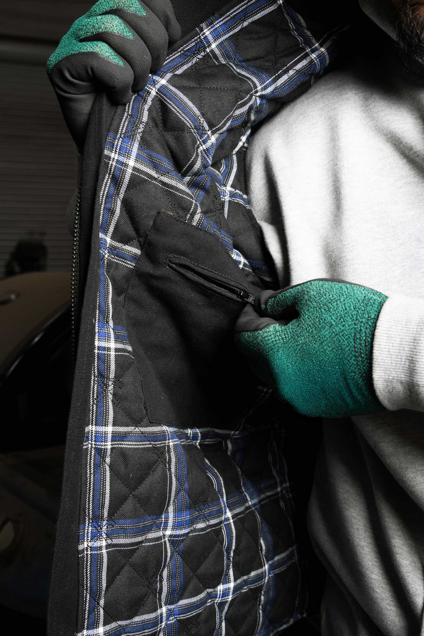 - Diamond-stitched quilted flannel liner in blue, black, and white plaid for added warmth and comfort