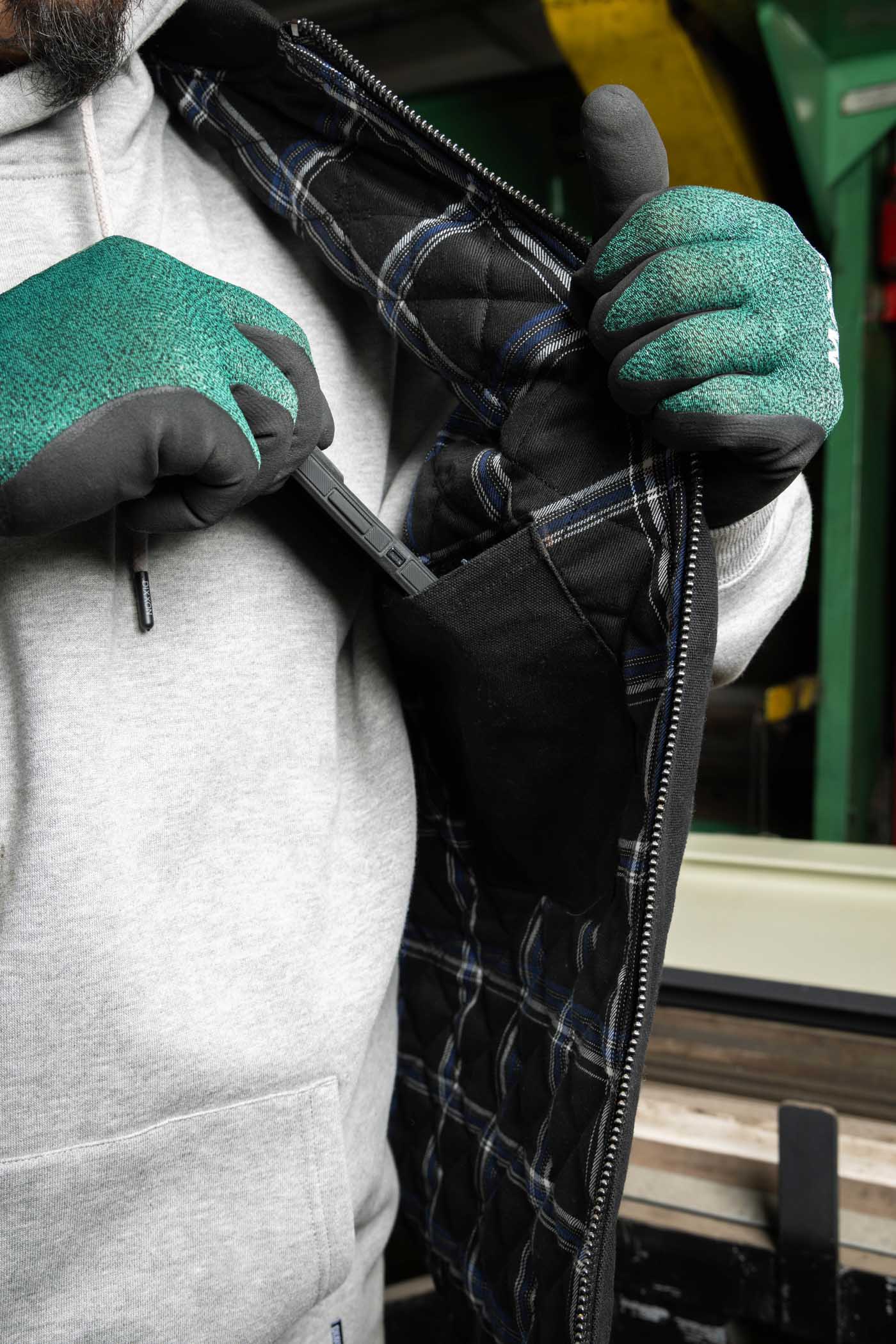 - Split interior storage (zip + Velcro®) for secure carry of phone, wallet, or tools
