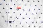 - White shirt with a blue skeleton hand print throughout