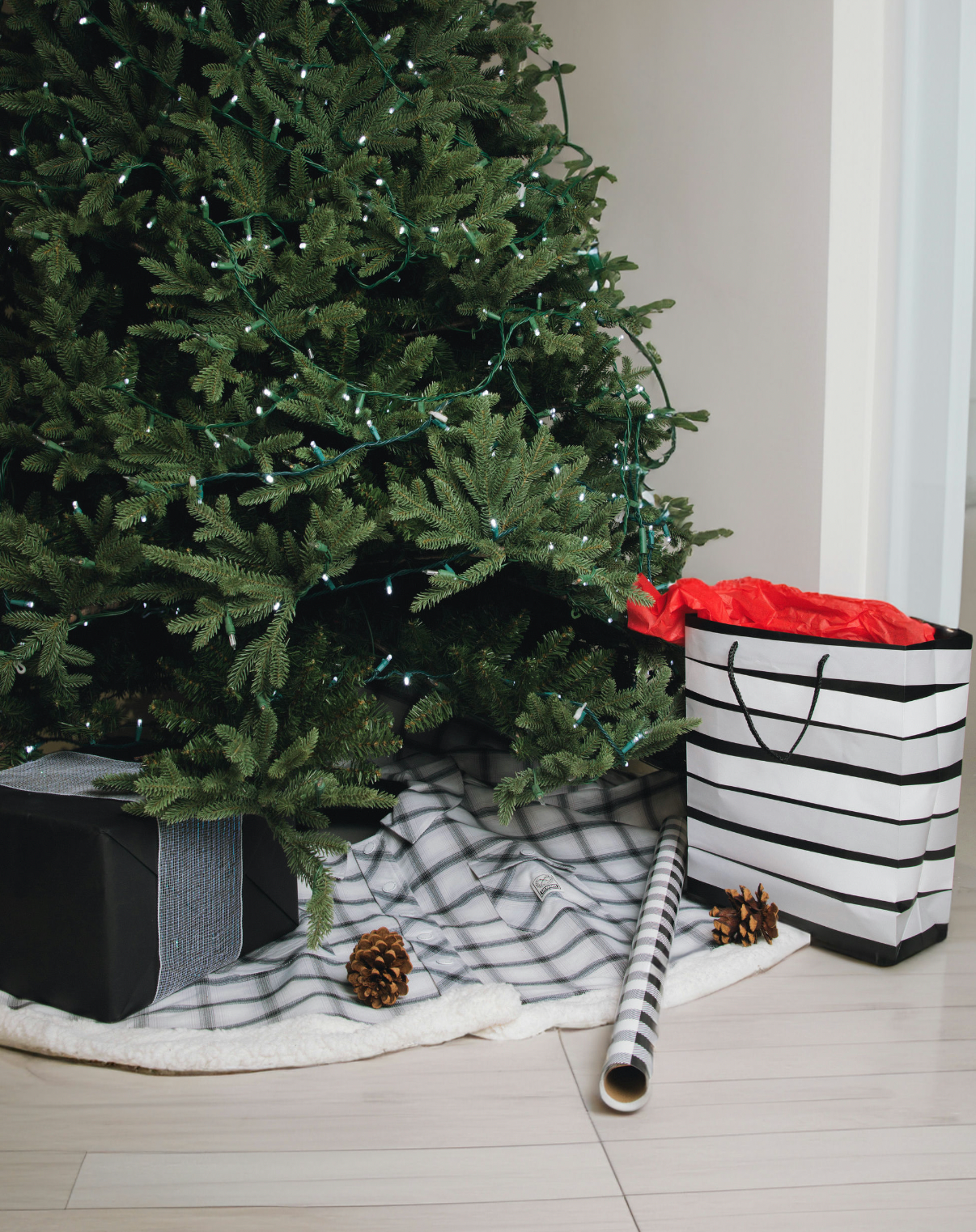 - White, black, and gray plaid patterned flannel tree skirt