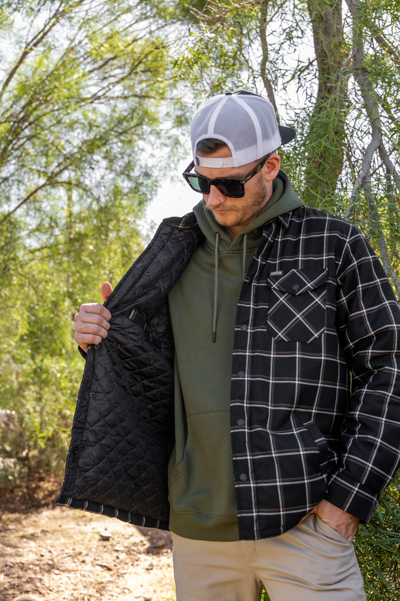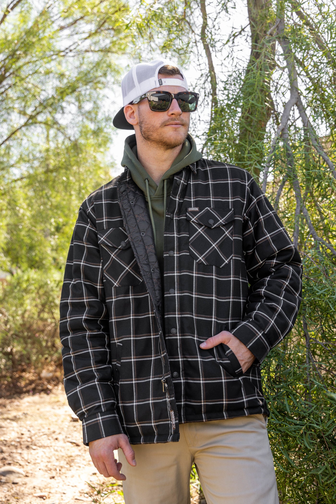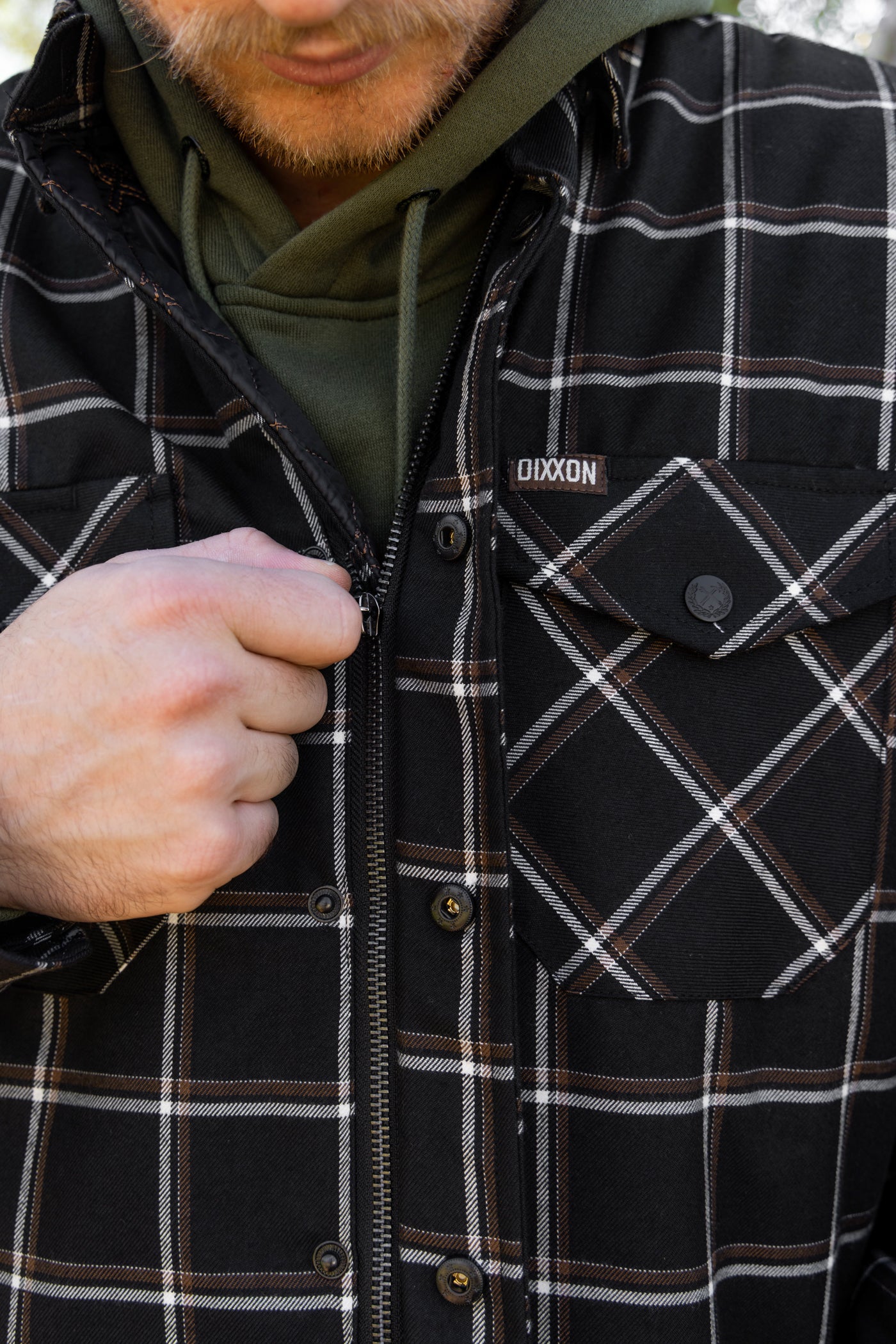 - Dixxon brand tag on the left chest pocket