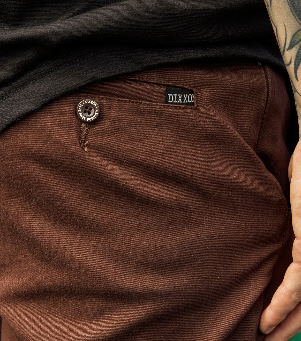 - Dual back welt pockets with Dixxon brand tag on the right pocket